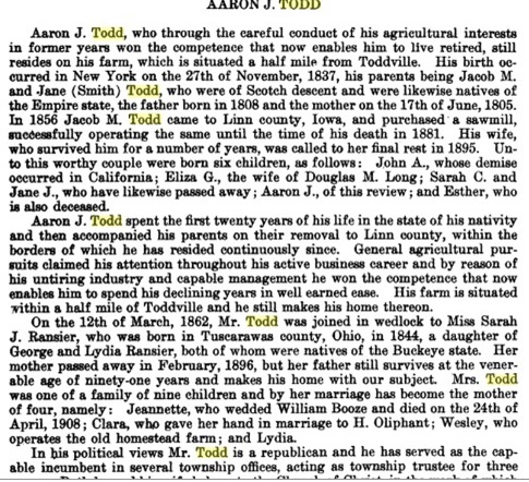 Aaron James Todd 1837-1918 md Sarah Ransier b 1844 Ohio d 1919